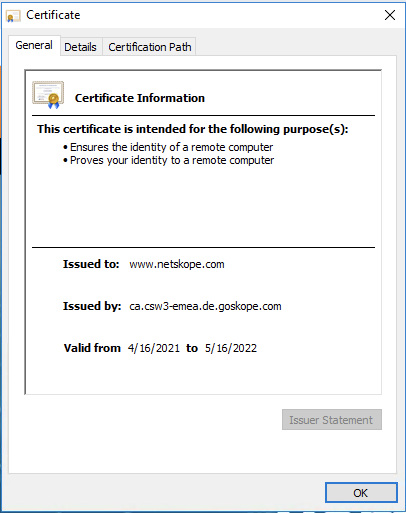 Step 10 Click the lock icon in the URL field to see if the certificate actually came from *.goskope.com. This means the traffic is decrypted by Netskope, secured and then re-encrypted to the final destination server.