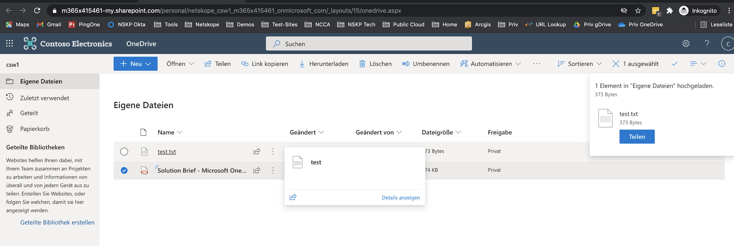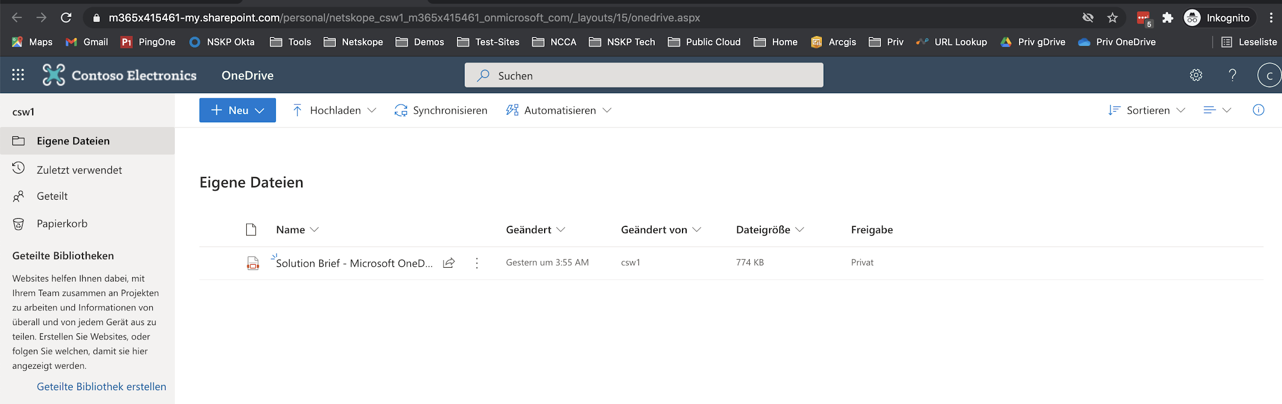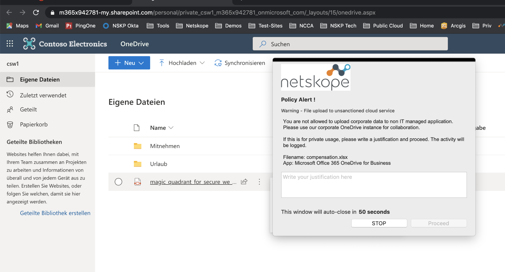 In this lab you act as an administrator allowing only access to a corporate sanctioned version of the collaboration application Microsoft / Office 365 (including OneDrive). You will first identify that all uploads to your corporate O365 OneDrive is working with the user alert we saw in Lab 2. Then you create a policy on the Netskope Security Cloud to allow uploads for your user to only the NetskopeCSW instance of Microsoft / Office 365.