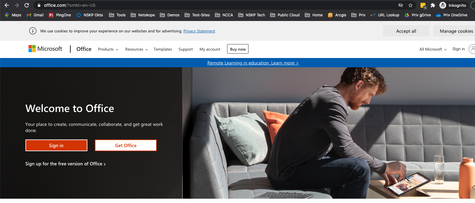 Step 1 Verify first that you can not upload files to your corporate OneDrive. Navigate to [https://www.office.com] and click Sign in, located at the left of the page.
