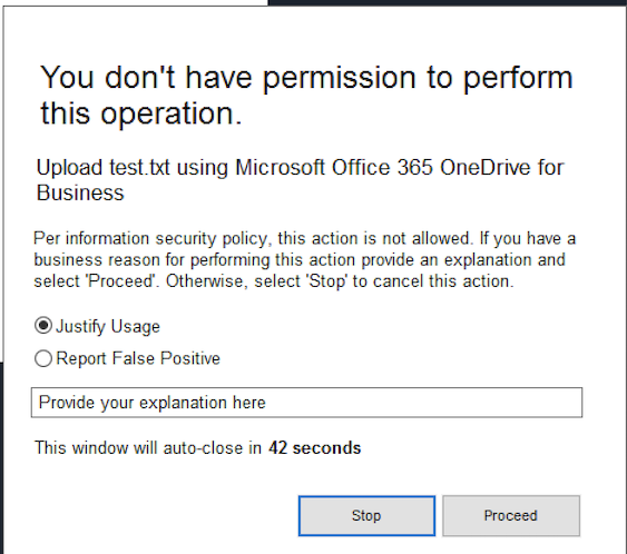 Step 4 Now, please try to upload any file from your local computer. You should receive a coaching user notification to explain that it is not allowed to upload company files to non-corporate cloud storage applications. If other than the corporate use of that upload (e.g. private files), it might be ok to do so (like in the lab before).