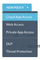 From the home screen of your Netskope tenant, Navigate to Policies > Real-time Protection, click new policy, "Cloud App Access".