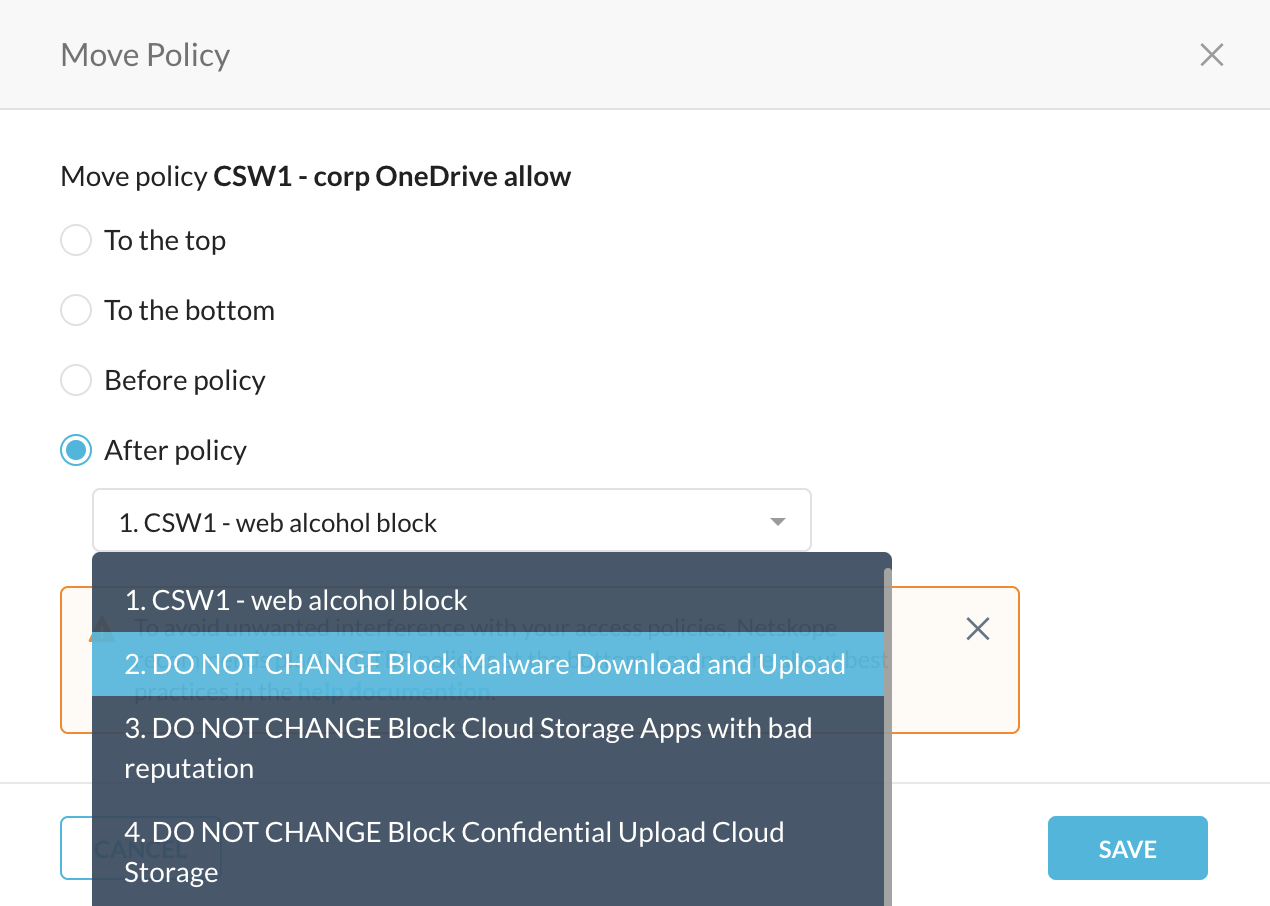 Step 6 Click Save and select After policy "DO NOT CHANGE Block Malware Download and Upload".